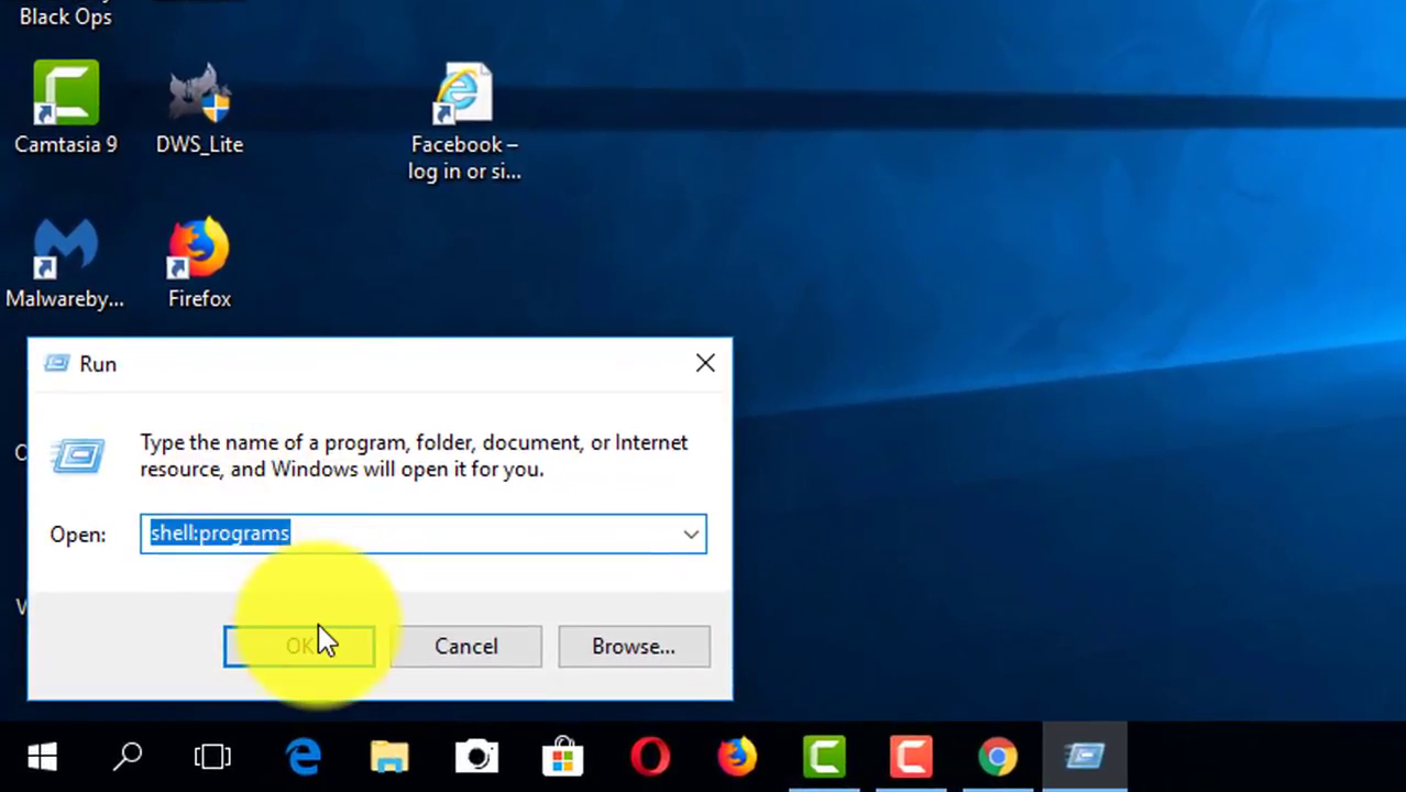 shell:programsinto the dialog and press Enter. This command opens the folder where Start Menu program shortcuts are stored.