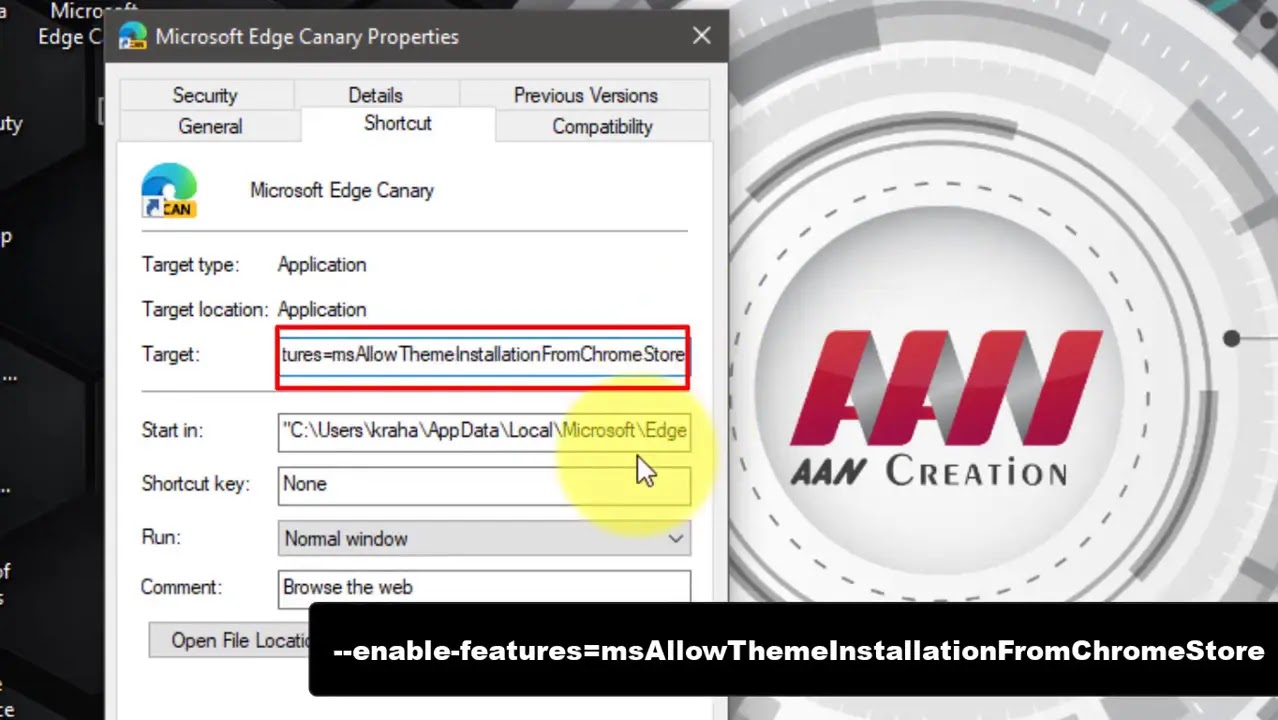 03. In the shortcut target text box, modify the command line by adding the following commands, after msedge.exe.
