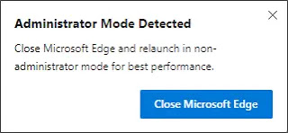 “Administrator Mode Detected” “For best performance, close Microsoft Edge and relaunch in non-administrator mode.”