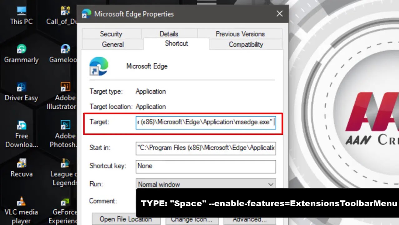 03 Type the following path after the msedge.exe portion in the shortcut target box. and click on apply.