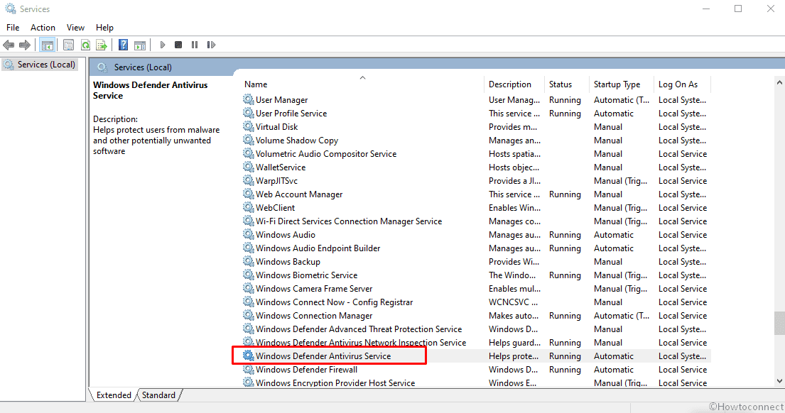 03. In the Services window, scroll down to find the Windows Defender Antivirus service.