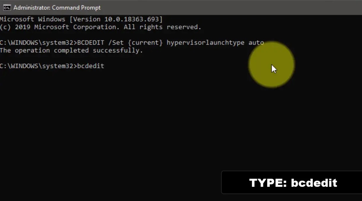 02. Type BCDEDIT /Set {current} hypervisorlaunchtype auto