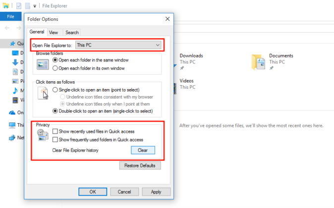 3. If you want to completely get rid of Quick Access/Home view from File Explorer, change the option “Open File Explorer to” from “Quick Access” to “This PC” using the drop-down list. It will set the old This PC view as default in File Explorer & you will always have disk drives page visible whenever you open File Explorer.