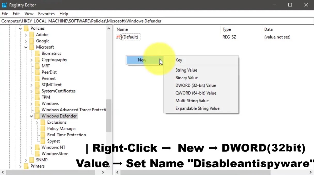 select New ➡ Dword (32-bit) Value, and name it DisableAntiSpyware.